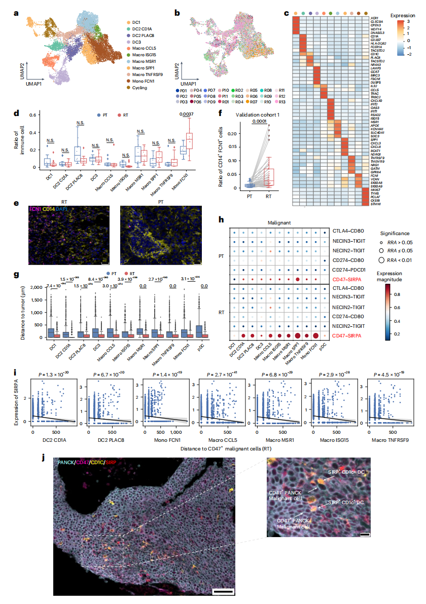 作者进一步在髓系谱系中鉴定出11个亚群,包括5个巨噬细胞亚群,1个单核细胞亚群,4个树突状细胞亚群和一个活跃增殖细胞亚群(图8a-8b)。单核细胞 FCN1表现出FCN1、VCAN、S100A8和S100A9的高表达,且在复发性鼻咽癌中的比例高于原发性鼻咽癌(图8c-8d)。多色免疫荧光染色验证了RT样本与PT样本相比,单核细胞 FCN1的丰度增加(图8e-8f)。 基于空间转录组学分析显示,与原发性鼻咽癌相比,髓系细胞在复发性鼻咽癌中明显更靠近肿瘤细胞,并表现出更显著的相互作用对(图8g)。细胞通讯表明,rNPC中恶性细胞与髓系细胞通过CD47- SIRPα 存在更密切的相互作用(图8h)。此外,在RT样本中,靠近CD47阳性恶性细胞的髓系spots显示出显著更高的 SIRPα 表达水平(图8i)。多色IHC同时证实SIRPα⁺CD1C⁺树突细胞定位于CD47⁺复发恶性细胞周边(图8j)。