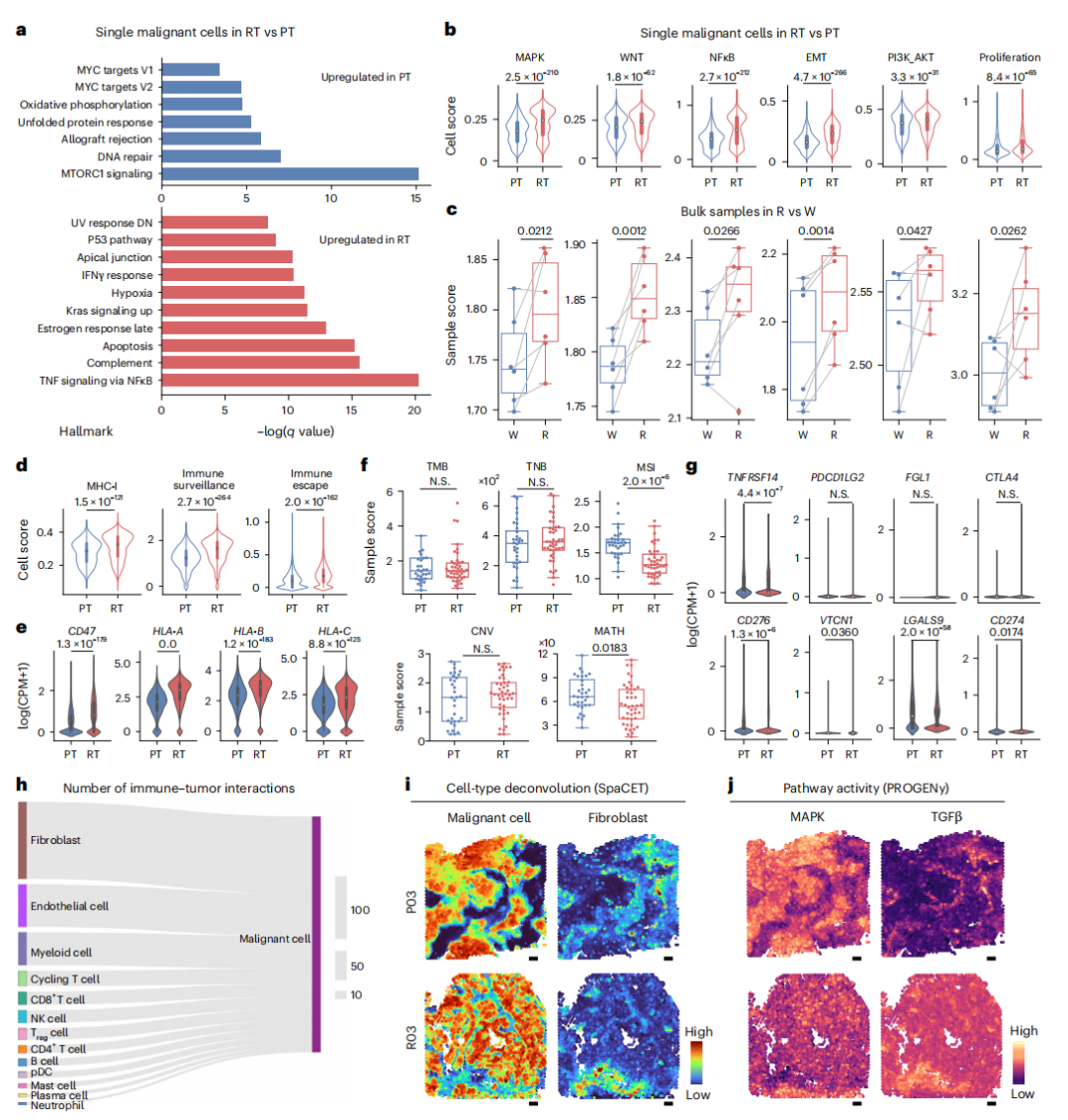 作者针对肿瘤细胞进行组间差异分析,结果显示PT上调基因富集于细胞周期通路,而RT上调基因富集于免疫应答通路,且RT样本展现出更高的免疫炎症和癌症信号,如NF-κB、PI3K-AKT、MAPK和P53通路(图2a-2b)。放疗抗性细胞系的bulk-RNA测序结果也证明RT的放疗抗性与NF-κB、MAPK和PI3K-AKT通路的上调相关(图2c)。此外,RT还体现出更强的免疫逃逸特征,在与免疫逃逸相关的基因中,RT样本的恶性细胞中 CD47 和 HLA-A/HLA-B/HLA-C 表达增加(图2e)。关于肿瘤的抗原性,PT和RT样本之间肿瘤抗原性(包括TMB、TNB和CNV)无显著变化,RT的肿瘤异质性显著低于PT样本(图2f)。关于免疫原性,RT样本中VCAM1的表达更高,而TNFRSF14、CD276、LGALS9和CD274在PT样本中的表达显著增加(图2g)。综上,RT具有高放疗抗性和免疫逃逸的能力,这些能力不依赖于免疫原性和抗原性降低的特定方式存在。
