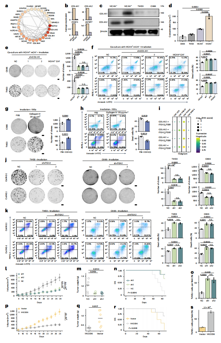作者通过对在MCAM⁺mCAFs中差异显著的基因进行网络分析,确定ACTA2、COL4A2、ITGA1及COL4A1为潜在的关键枢纽基因,其中分泌蛋白编码基因COL4A1、COL4A2、PDGFA与IGFBP7在单细胞与Bulk-RNA测序数据集均显著富集(图4a-b)。COL4A1和COL4A2编码IV型胶原的α1和α2链,作者发现IV型胶原蛋白在蛋白水平上在MCAM⁺mCAFs中表达上调(图4c,d)。体外实验表明,IV型胶原处理鼻咽癌细胞后,鼻咽癌细胞的放疗抗性显著提高(图4e-h )。整合素是常见的胶原受体,细胞通讯分析表明,恶性细胞与MCAM⁺mCAFs通过COL4A1/2-ITGA2、ITGB1 和 COL4A1/2-ITGA3_ITGB1轴的串扰增强(图4i)。体外实验验证表明,当在C666和TWO3细胞中敲低ITGA2时,显著降低了外源处理IV型胶原诱导的放疗抗性(图4j-4k )。体内实验也表明,ITGA2 KD的肿瘤细胞即使在与MCAM⁺mCAFs共注射并在晚期接受辐照时,其成瘤能力也较弱,且肿瘤细胞凋亡显著增加(图4l-o)。先前的研究表明,胶原主要通过结合整合素激活下游的PI3K-AKT信号通路并发挥其生物学效应,经体内实验验证,当PI3K-AKT通路被抑制时,MCAM⁺mCAFs的促瘤作用显著减弱(图4p-4s)。综上,MCAM⁺mCAFs通过分泌IV型胶原激活肿瘤细胞表面受体ITGA2介导放疗抗性。