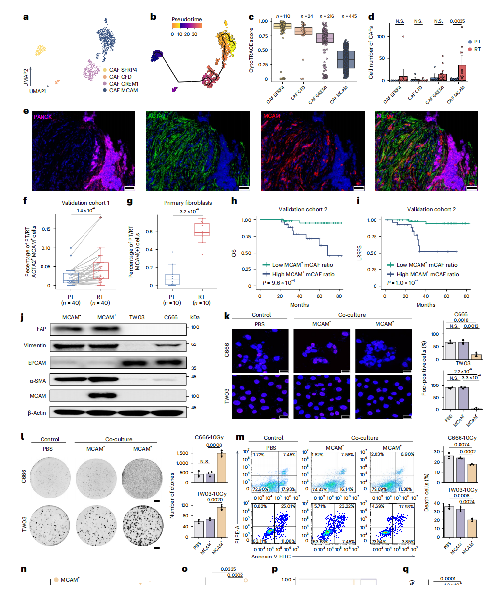 除了癌症相关通路的自我激活外,TME也可能促进rNPC恶性细胞放疗抗性的发展,细胞通讯分析结果显示,成纤维细胞与恶性细胞的相互作用数量最多(图2h-2j )。通过对成纤维细胞(CAF)进行单细胞聚类分析,识别出四个亚群(图3a-3c),其中MCAM⁺mCAFs在复发性肿瘤(RT)中的比例显著高于原发性肿瘤(PT)(图3d)。该结果经多色免疫荧光技术证实,RT样本中可检测到大量ACTA2和MCAM双阳性成纤维细胞(图3e-f)。流式细胞分析进一步量化显示,RT样本MCAM⁺mCAFs占比中位数高达58.4%,约为PT样本(6.275%)的9倍(图3g)。临床预后分析表明,MCAM⁺mCAFs比例升高与更差的局部区域无复发生存率(LRRFS)和总体生存率显著相关(图3h-i)。