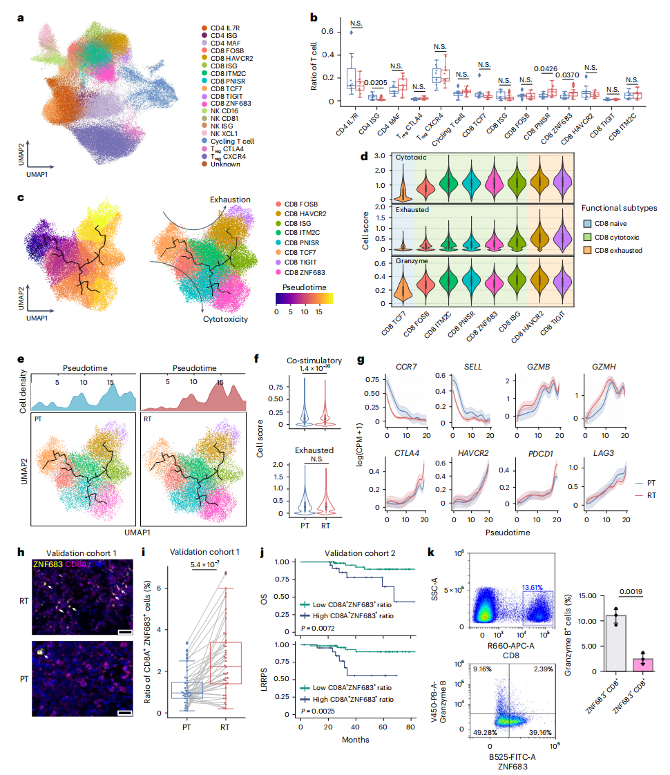 在比较原发(PT)和复发(RT)鼻咽癌样本的TME差异时,作者发现rNPC中CD8⁺ZNF683⁺T细胞和CD8⁺PNRSR⁺T细胞的丰度显著高于pNPC(图6b)。通过Monocle 3的拟时序分析揭示了CD8⁺T细胞的分化轨迹:该过程起始于CD8⁺TCF7⁺T细胞,经历以CD8⁺FOSB⁺和CD8⁺ITM2C⁺为特征的中间细胞毒性状态,最终分化为两个终末亚群——CD8⁺TIGIT⁺的耗竭性T细胞与CD8⁺ZNF683⁺的记忆性T细胞(图6c)。在此分化过程中,细胞毒性和耗竭特征评分同步升高(图6d)。值得注意的是,初始CD8⁺TCF7⁺细胞主要分布于CD8⁺ ZNF683⁺细胞比例较低的原发肿瘤中,而CD8⁺ZNF683⁺细胞则在复发肿瘤中富集并呈现组织驻留特征(图6c-6e)。进一步分析表明,PT和RT样本间T细胞耗竭评分无统计学差异,但复发肿瘤中T细胞的共刺激功能显著减弱(图6f-6g)。在临床验证队列1中,RT样本的CD8⁺ZNF683⁺细胞比例显著升高(图6h-6i)。队列2的生存分析显示,该细胞高比例患者的总生存期(OS)和局部无复发生存期(LRRFS)显著缩短(图6j)。为解析其功能特性,研究者分离肿瘤浸润的CD8⁺ZNF683⁺和CD8⁺ZNF683⁻细胞群,通过流式细胞术检测细胞毒性标志物颗粒酶B(GZMB)的表达。结果显示CD8⁺ZNF683⁺细胞的GZMB表达显著降低,证实其细胞毒性功能减弱(图6k)。