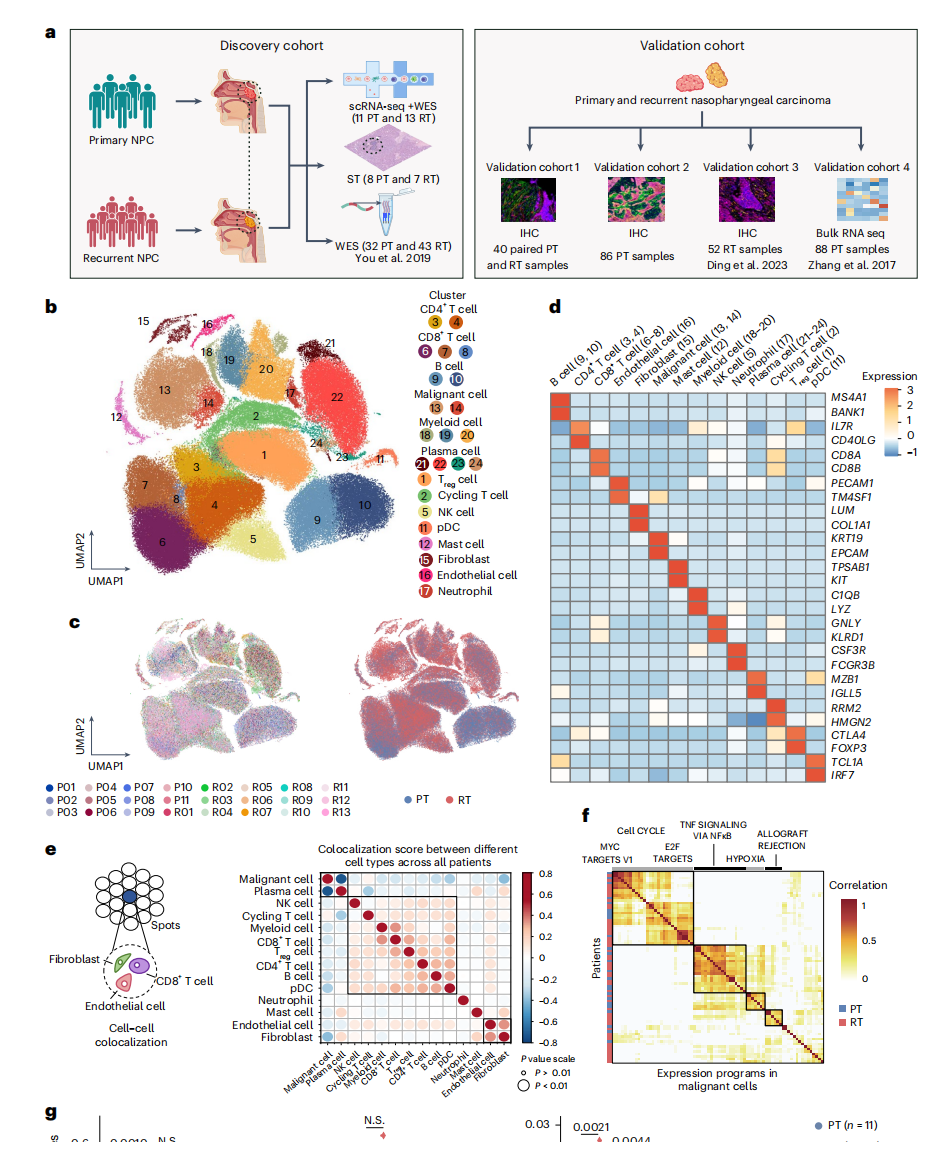 为了解析原发性鼻咽癌(pNPC)和复发性鼻咽癌(rNPC)之间的肿瘤生态系统差异,作者收集了11例初治pNPC患者(PT样本)和13例rNPC患者(RT样本)的肿瘤标本进行scRNA-seq和全外显子组测序(WES),并收集了相应的8个PT样本和7个RT样本进行空间转录组学分析。此外,作者还纳入了4个验证队列来确认发现队列中的差异并进行预后分析,队列1:40例配对PT和RT患者进行免疫组织化学(IHC)染色;队列2:来自中山大学肿瘤防治中心回顾性队列的86例接受根治性放疗的pNPC患者;队列3:52例接受PD-1抑制剂和抗VEGFR抗体治疗的复发或转移性鼻咽癌患者进行IHC染色;队列4:先前发表中报告的88个PT样本中的批量RNA测序数据用于验证和预后分析(图1a)。