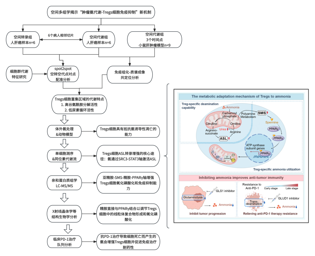 调控性T细胞(Tregs)如何适应恶劣的肿瘤代谢微环境以抑制抗肿瘤免疫的具体机制,目前尚不完全明确。本研究通过空间多组学分析发现,人类肝细胞癌组织中存在以高谷氨酰胺分解-低尿素循环为特征的代谢异质性区域,该区域内Tregs广泛分布,而CD8+及CD4+效应T细胞则出现凋亡。作者发现Tregs细胞通过上调精氨琥珀酸裂解酶(ASL)表达,利用尿素循环实现氨解毒;同时,氨也可在FOXP3转录因子调控的精胺合酶(SMS)作用下转化为精胺。X射线晶体学分析证实了精胺与PPARγ之间的直接相互作用,该作用可全面调控多种线粒体复合体蛋白的转录,从而增强Tregs细胞的氧化磷酸化能力及免疫抑制功能。临床观察显示,经抗PD-1治疗后死亡的肿瘤细胞通过转脱氨作用释放氨,进而强化Tregs细胞功能并导致免疫治疗耐药。针对氨生成过程以抑制Tregs细胞功能,可能为抗肿瘤免疫治疗提供一种潜在策略。