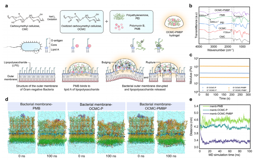 本研究设计了一种协同LPS结合水凝胶(OCMC-PMBP),整合了多粘菌素B(PMB) 的膜裂解能力与聚乙烯亚胺(PEI)的静电捕获能力,旨在实现细菌清除、 LPS中和、免疫微环境重塑的三重目标。