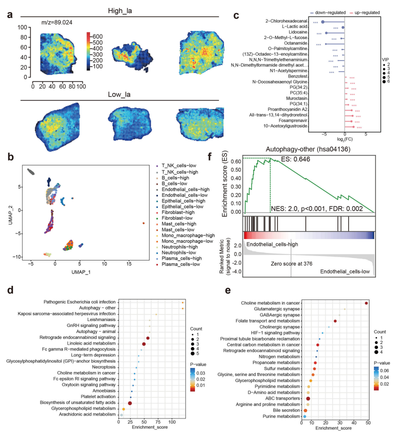 代谢成像分析确认高乳酸组整体乳酸水平显著高于低乳酸组,且乳酸分布呈现明显的空间梯度。有趣的是,尽管高乳酸组中多数细胞类型乳酸含量升高,内皮细胞却表现出较低的乳酸积累,提示其具有独特的代谢表型。丙酮酸分析进一步揭示,低乳酸组整体丙酮酸水平较高,而高乳酸组中免疫细胞和上皮细胞的丙酮酸含量下降,成纤维细胞则呈现升高趋势,反映不同细胞类型在乳酸压力下采取差异化的代谢策略。内皮细胞特异性代谢谱分析发现,高乳酸条件下自噬相关代谢物上调,而胆碱代谢和突触相关代谢物下调,提示内皮细胞通过激活自噬和调整脂代谢适应乳酸富集环境(图7)。