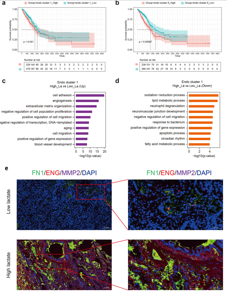结合单细胞转录组数据和TCGA临床队列,本研究深入探讨了不同内皮细胞亚群在肺腺癌预后中的意义。生存分析显示,内皮细胞亚群1和亚群9的富集与患者总生存期显著缩短相关,其中亚群9的预后关联尤为强烈(图8A,B)。基因功能分析表明,亚群1高表达血管生成和细胞黏附相关基因,低表达氧化还原和脂代谢通路基因;亚群9则富集未折叠蛋白应答和热应激基因,下调翻译起始和抗原呈递通路。这些转录特征提示,高乳酸诱导的内皮亚群倾向于促血管生成、应激适应和免疫调节表型(图8C,D)。免疫荧光实验进一步验证,高乳酸肺腺癌组织中内皮标记物FN1、ENG和MMP2表达增强,血管密度显著升高。