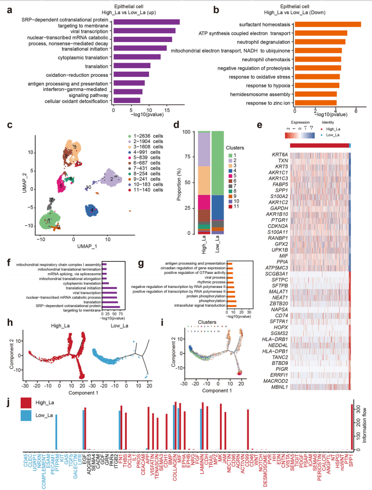 基因功能富集分析显示,高乳酸上皮细胞中内质网应激、蛋白质合成和病毒转录等分泌和应激相关通路上调,而肺泡分化和线粒体呼吸功能相关基因表达下降,提示上皮细胞发生去分化并转向糖酵解代谢(图3A,B)。亚群分析识别出一个在高乳酸富集的上皮亚群-CLUSTER5,表达应激和代谢适应基因,该亚群中肺泡分化标记物下调,抗原呈递功能受损。拟时序结果显示其在高乳酸组中表现出与低乳酸组不同的发育路径。细胞间通讯分析进一步发现,高乳酸条件下上皮细胞通过SPP1、CD99、THBS等通路增强与周围细胞的相互作用,促进细胞黏附和免疫调节。