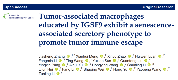 近日,滨州医学院李尊岭教授团队在Journal for Immunotherapy of Cancer发表的最新研究“Tumor-associated macrophages educated by IGF9 exhibit a senescence-associated secretory phenotype to promote tumor immune escape”,揭示了IGSF9通过与TMUB1互作,激活IL-6/STAT3通路,进而诱导肿瘤相关巨噬细胞进入衰老状态,促进肿瘤免疫逃逸的新机制。