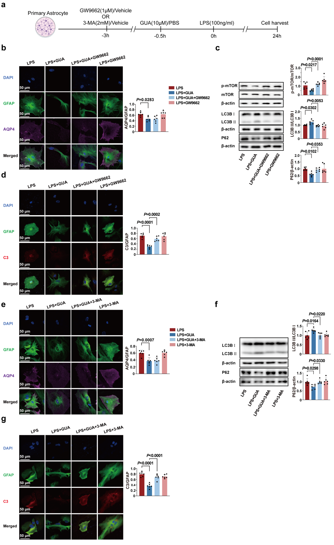为确认PPAR-γ/mTOR通路及自噬在调节星形胶质细胞反应性中的作用,作者分别使用PPAR-γ抑制剂GW9662和自噬抑制剂3-MA进行验证(Fig. S15a)。在LPS刺激的星形胶质细胞中,添加GW9662不影响α2A-AR激动剂对AQP4的下调作用(Fig. S15b),但削弱了其对自噬的促进(表现为对LC3B-II/I比率、P62及p-mTOR/mTOR比率的调节作用减弱)(Fig. S15c),并阻断了α2A-AR激动剂抑制细胞反应性的效果(Fig. S15d)。同样,添加3-MA也不影响α2A-AR激动剂对AQP4的调控(Fig. S15e),但减弱了其对自噬指标的改善作用(Fig. S15f),并使其无法抑制LPS诱导的细胞反应性升高(Fig. S15g)。综上,PPAR-γ/mTOR通路介导了α2A-AR对自噬的调节,而自噬的激活是α2A-AR激动剂减轻星形胶质细胞反应性的必要条件。