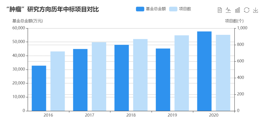 2016-2020年肿瘤研究方向中标项目数及总金额: