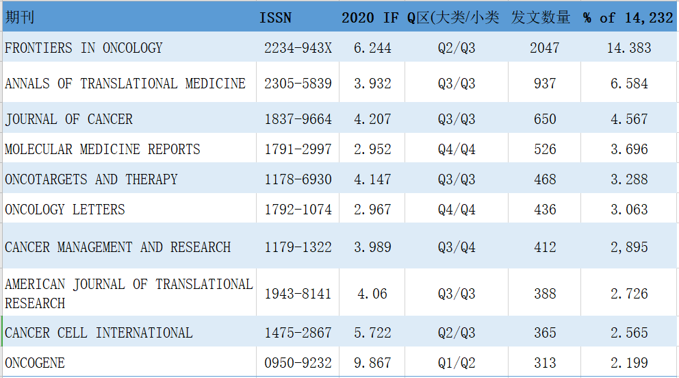 国自然资助的肿瘤学领域文章主要发表在Q3\Q4区期刊上,其中FRONTIERS IN ONCOLOGY期刊以2047篇发文量据榜首,其次是ANNALS OF TRANSLATIONAL MEDICINE(937篇)和JOURNAL OF CANCER(650篇),另外MOLECULAR MEDICINE REPORTS(526篇)和ONCOTARGETS AND THERAPY(468篇)也是国自然项目负责人考虑的主要期刊之一。