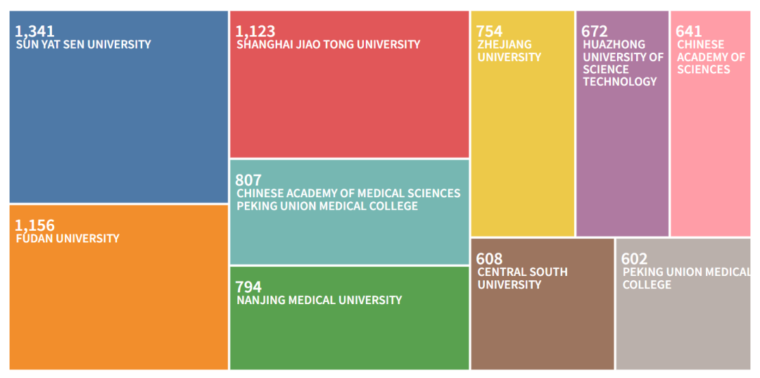 国内发表论文的前5研究机构分别是:中山大学(1339篇)、复旦大学(1153篇)、上海交通大学(1120篇)、中国医学科学院北京协和医学院(805篇)以及南京医科大学(793篇)。