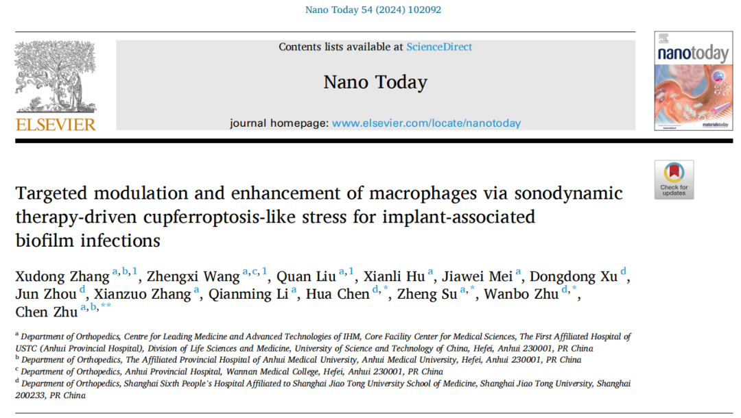 Nano Today | 通过声动力疗法驱动的铜铁死亡样应激对巨噬细胞进行靶向调节和增强以治疗植入物相关的生物膜感染