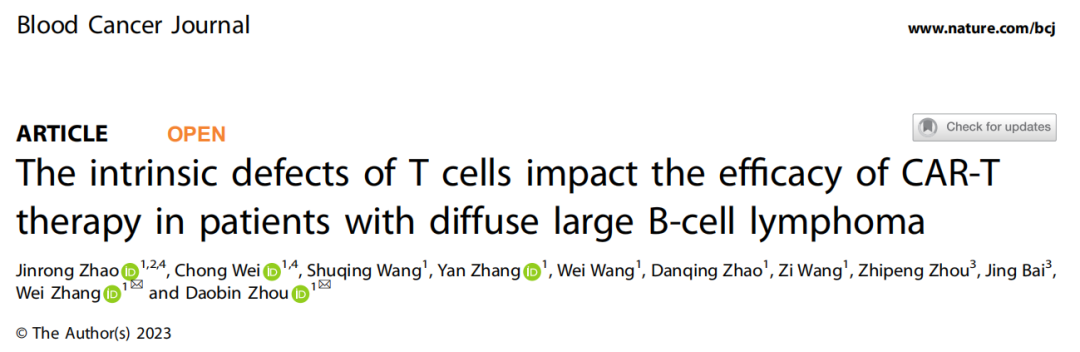 Blood Cancer Journal | T细胞的内在缺陷影响了CAR-T细胞疗法在弥漫性大B细胞淋巴瘤中的疗效