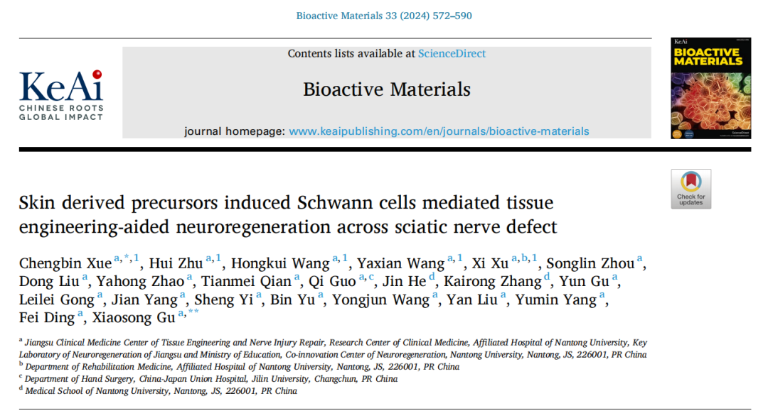 Bioactive Materials | 皮肤源性前体诱导施旺细胞介导的组织工程辅助坐骨神经缺损神经再生