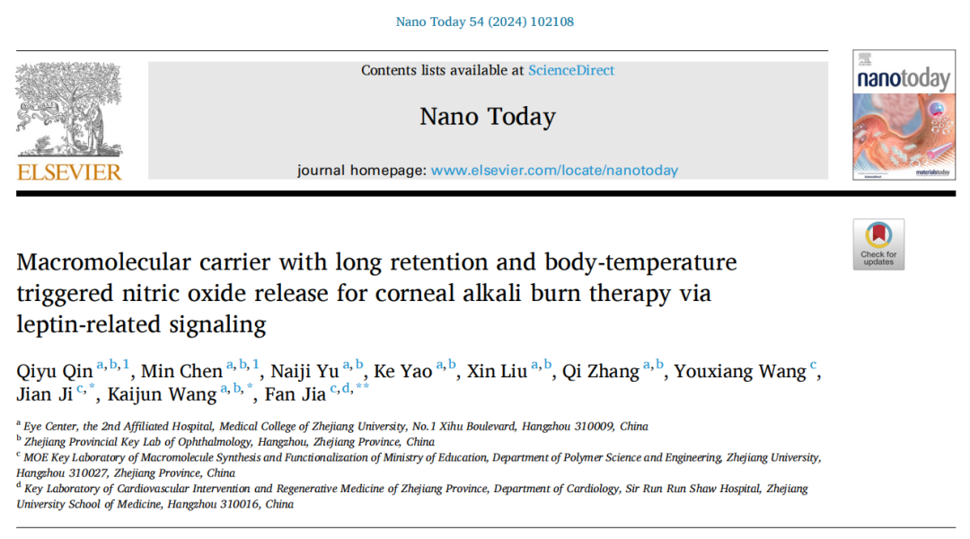 Nano Today | 可长时间滞留和体温触发的大分子载体通过瘦素相关信号通路释放一氧化氮治疗角膜碱烧伤