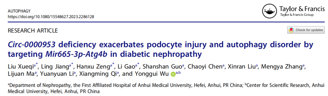 Autophagy | Circ-0000953缺陷通过靶向Mir665-3p-Atg4b在糖尿病肾病中加剧足细胞损伤和自噬障碍