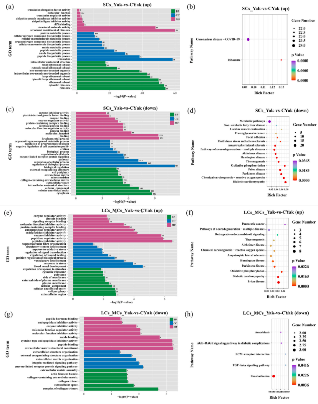 5.牦牛和犏牛睾丸组织体细胞功能富集分析 体细胞在睾丸发育和精子发生过程中起着重要作用,作者进一步对体细胞SCs和LCs_MCs细胞群进行了组间差异基因分析及差异基因GO和KEGG功能富集分析。 SCs细胞组间差异富集结果显示,在犏牛表达下调的基因富集在多种生物活性通路上,包括“rRNA结合、泛素连接酶抑制剂、p53类介质调控信号转导和MHC蛋白复合物活性”(图4a);上调的基因在“分子功能抑制剂、细胞凋亡调控、细胞群增殖负调控和程序性细胞死亡活性调控”等方面富集(图4c)。 对LCs_MCs差异表达基因进行GO\KEGG富集分析表明,犏牛表达上调的基因在“半胱氨酸型内肽酶抑制剂、分子功能抑制剂和肽激素结合”方面显著富集;下调的基因在“与信号受体结合、分子功能调节、生物过程的正向调节和细胞通讯活性调节”相关的功能中富集。