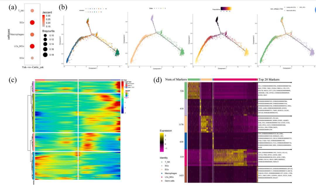 4. 体细胞的组间比较及LCs_MCs细胞轨迹分析 作者比较了5个不同体细胞群在牦牛和犏牛样本之间的差异。Jaccard和Bray-Curtis分析表明,相对于其他体细胞群,支持细胞和间质细胞_肌样细胞在牦牛和犏牛之间的差异更明显(图3a)。作者后续着重分析了睾丸间质细胞和肌样细胞。 在最初始的细胞大类降维聚类结果里,LCs由cluster1、3、4、7、9和18组成,MCs包含cluster6、8、9和13。同时在同一cluster中有检索到以上两类细胞类型的标记基因表达,表示这两种细胞类型之间有一定程度的细胞重叠。曾有文献报道:人类青少年中的MCs和LCs来自相同的祖细胞,为了探究犏牛中MCs和LCs是否也有共同来源,作者对cluster1、3、4、6、7、8、9、13和18进行了拟时序分析。结果显示,LCs和MCs是由同一细胞类型-祖细胞分化而来的(图3b)。