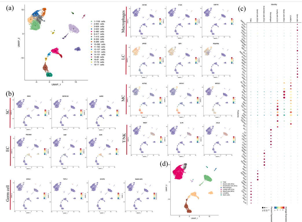 3. 睾丸单细胞测序及细胞类型鉴定 为了进一步了解杂交对睾丸的具体影响,作者收集了牦牛及犏牛的睾丸样本进行单细胞测序。对经过质控保留的高质量细胞采用UMAP方法进行降维聚类。将细胞分为了18个簇(图2a)。 根据已报道的标记基因,将这18个细胞簇注释为7种细胞类型(图2d),包括支持细胞:SCs(INHA、DEFB123和AARD)、内皮细胞:ECs(VWF、PECAM1和KDR)、巨噬细胞(CD163、C1QA和CSF1R)、间质细胞:LCs(APOD、IGF1和PDGFRA)、肌样细胞:MCs(ACTA2、MYH11和WFDC1)、T/NK细胞(IL7R、NKG7和CCL5)和生殖细胞(UCHL1、TKTL1、SYCP3和RAD51AP2)(图2b,2c)。