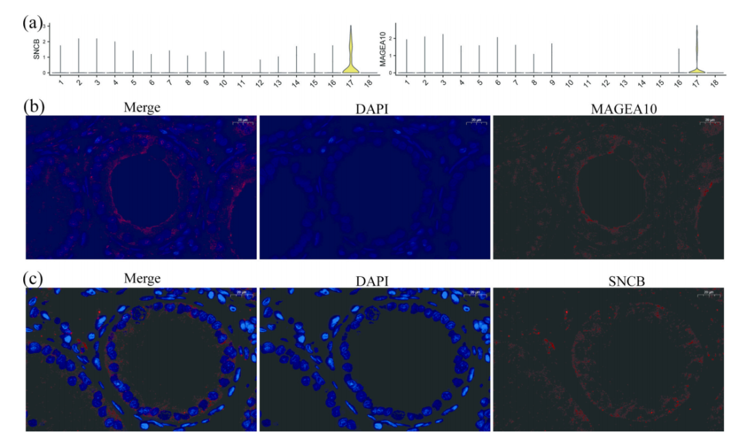 7. SCs细胞标记基因的验证 以上通过靶向代谢组学及单细胞转录组学对牦牛和犏牛睾丸的代谢和转录异质性进行了相关研究。目前,高分文章的趋势是组学分析加上湿实验验证,为了验证特殊物种单细胞测序数据的可靠性及数据挖掘的特异性,基于单细胞数据,作者选择了SCs细胞中特异表达的MAGEA10和SNCB基因(图6a)进行免疫荧光染色。结果显示,在生精小管壁到中央管腔的SCs中均有检测到基因MAGEA10和SNCB实际表达(图6b,2c)。综上所述,免疫荧光结果与scRNA-seq结果保持一致,确定了单细胞测序技术应用于特殊物种的普适性和可靠性。