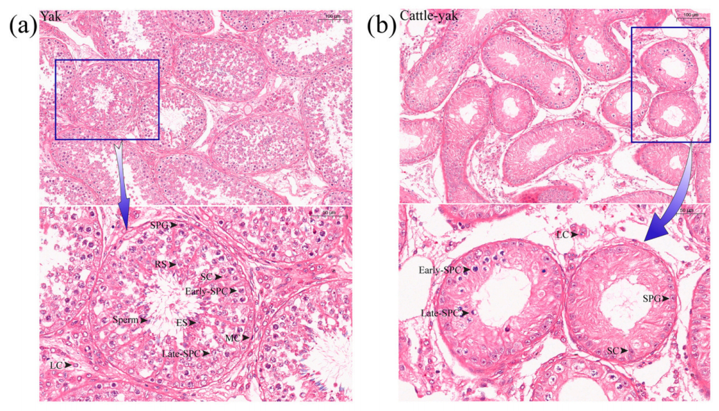 1. 睾丸组织学分析 为了探究牦牛和犏牛的组织学差异,作者对睾丸进行了初步测量。结果显示牦牛的平均睾丸周长、体重和长度均高于杂交后代。牦牛睾丸的生精小管的直径也明显大于犏牛。在牦牛睾丸中,排列紧密的生精小管被丰富的疏松结缔组织和间质细胞包围,在生精上皮中明显有4-7层不同类型和亚型的生精细胞(图1a)。相比之下,犏牛的生精小管排列松散,直径不规则,曲细精管上皮发育不良,有些生精小管中只包含1-2层生精细胞(图1b)。