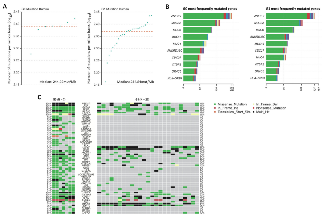 对7个来自G0组和25个来自G1组的腺瘤样本进行了全基因组测序分析,发现两组样本在结构变异或拷贝数变异方面没有显著差异(图1),G0组的突变负荷中位数略高于G1组(图1A)、每组中最常见的10个基因是相同的(ZNF717、MUC3A、MUC6、MUC16、MUC4、ANKRD36C、CDC27、CTBP2、OR4C5和HLA-DRB1,图1B),尽管两组样本中存在突变状态显著不同的基因(图1C),但这些基因不太可能反映出两组样本恶性变化倾向的普遍差异。