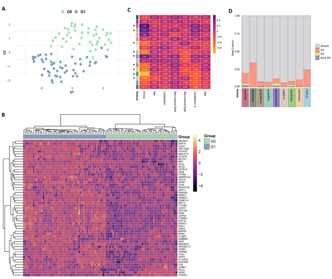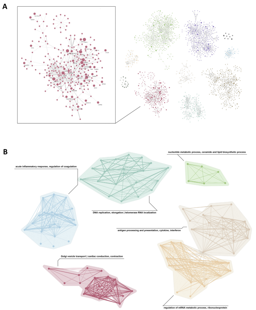 对蛋白进行加权共表达网络分析(WGCNA),17个模块中有9个模块与疾病有显著相关性(图2C、D)。利用STRING数据库提取蛋白质相互作用,发现每个模块都有复杂的蛋白质网络,并且许多共识蛋白质位于各自网络的边缘(图3)。其中最大的4个模块是dustyRed、oliveGreen、lavenderPurple和goldenBrown。值得注意的是,这些数据库存在固有偏差。高度研究的蛋白质,如转录因子或癌基因,通常具有更多注释交互作用和更强的实验支持,经常位于网络的中心。