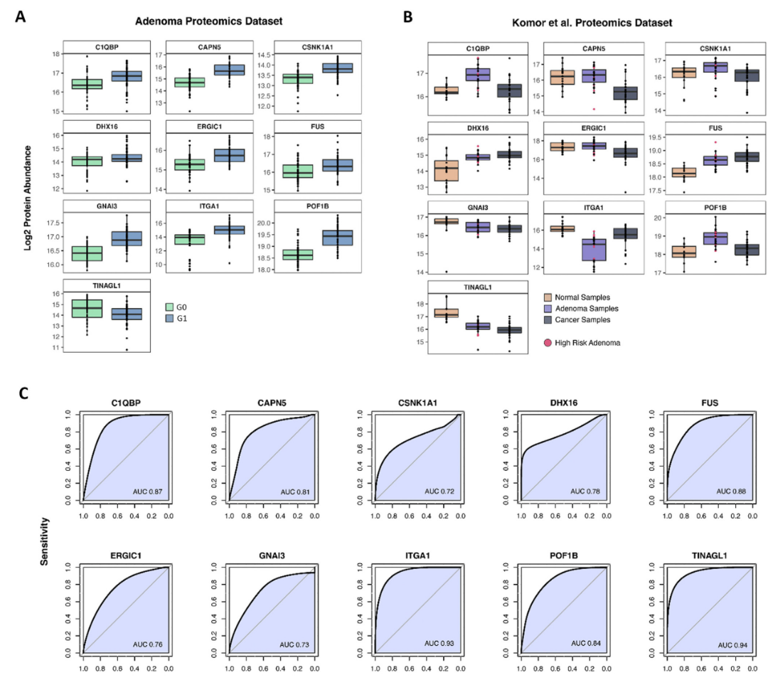 将本研究与其他腺瘤蛋白质组学数据集进行交叉分析,并排除了可能干扰样本。经过筛选和ROC分析(图4),最终确定了28个候选蛋白质,其中ITGA1显示出两组差异且在验证集中也被证实。在单蛋白候选中,将AUC的阈值设为≥0.8,筛选得到8个蛋白质进行多类别ROC分析,最高分数模型由C1QBP、ERGIC1和ORMDL1组成。