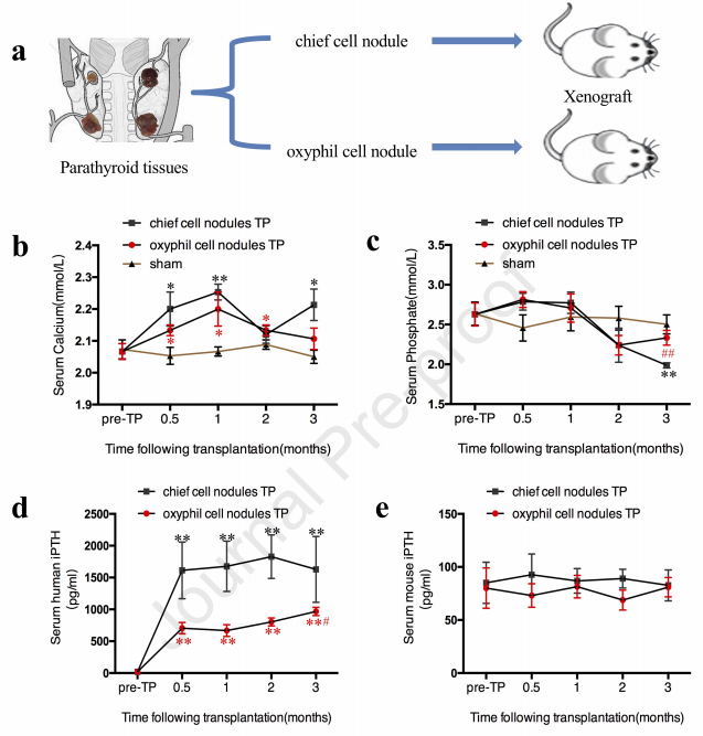 3. 移植裸鼠后,嗜酸细胞线粒体富集和细胞增殖明显改善 3.1 裸鼠移植前后血清生化指标的变化 为了研究尿毒症环境对主细胞向嗜酸细胞转化的影响,进行了裸鼠移植研究。结果显示,移植后血钙浓度升高,主细胞和嗜酸细胞移植组间无差异;2个月时血清磷浓度下降,3个月时嗜酸细胞移植组血清磷浓度有差异。人iPTH水平在移植后显著上调,主细胞移植组更高,但经蛋白校正后,嗜酸细胞移植组iPTH水平更高。小鼠血清iPTH水平无明显变化,但其与血清钙、磷水平趋势相关。