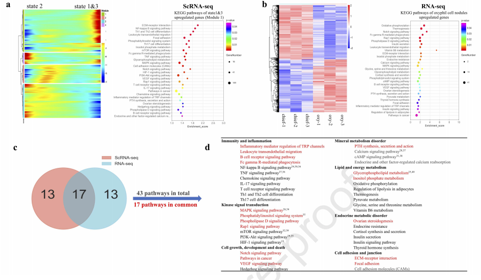 2.3 甲状旁腺转录组学中KEGG通路富集分析 为了研究主细胞向嗜酸性细胞转分化的分子机制,作者进行了一系列分析。首先,通过scRNA-seq发现差异表达基因在伪时间热图中的分布,然后,对state1和state3中上调的基因进行了KEGG通路富集分析。此外还利用已发表的RNA-seq数据对嗜酸细胞结节中的上调基因进行了KEGG分析。这些通路主要涉及免疫与炎症、脂质与能量代谢、矿物质代谢紊乱等方面。这些通路与尿毒症环境和线粒体生物发生有关,表明尿毒症相关信号通路可能促进主细胞的线粒体生物发生,导致其转化为嗜酸细胞。作者还确定了scRNA-seq中嗜酸细胞与主细胞之间的差异基因,以及已发表的RNA-seq中嗜酸细胞结节与主细胞结节之间的差异基因,369个共有基因。对scRNA-seq和RNA-seq中的差异基因进行KEGG通路富集分析,发现许多共有通路,进一步支持了尿毒症环境与主细胞向嗜酸细胞转分化之间的相关性。