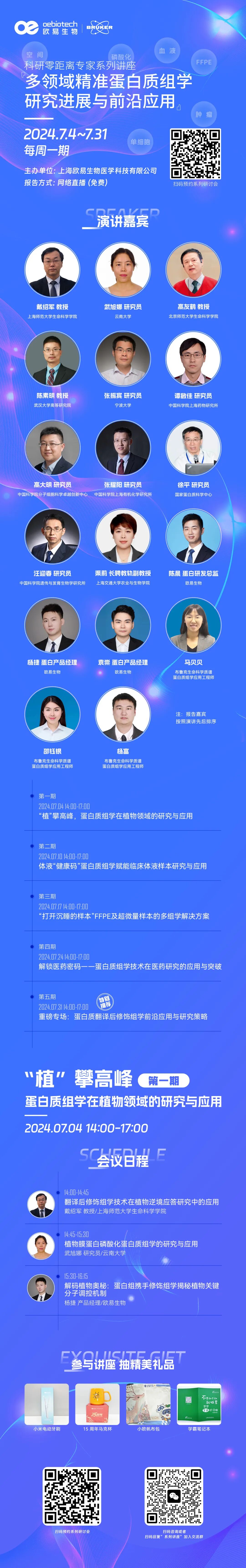 本期由欧易生物主办将于2024年7月4日~7月31日(每周一期)以“科研零距离专家系列讲座:多领域精准蛋白质组学研究进展与前沿应用”为主题,采用线上研讨会的形式聚焦不同领域和方向的蛋白组技术的研究和应用,我们将与十余位在蛋白质组学领域研究与应用的资深专家和学者一起共同探讨蛋白质组学的最新进展及其更广泛的潜在影响。